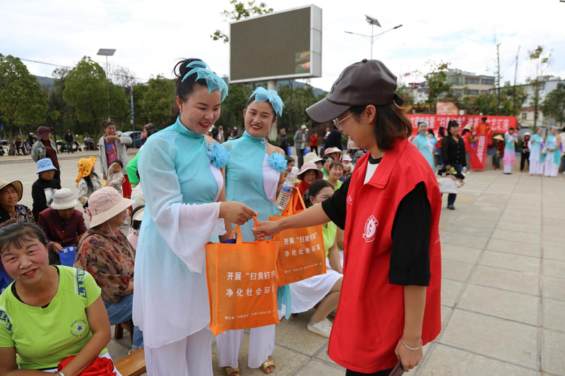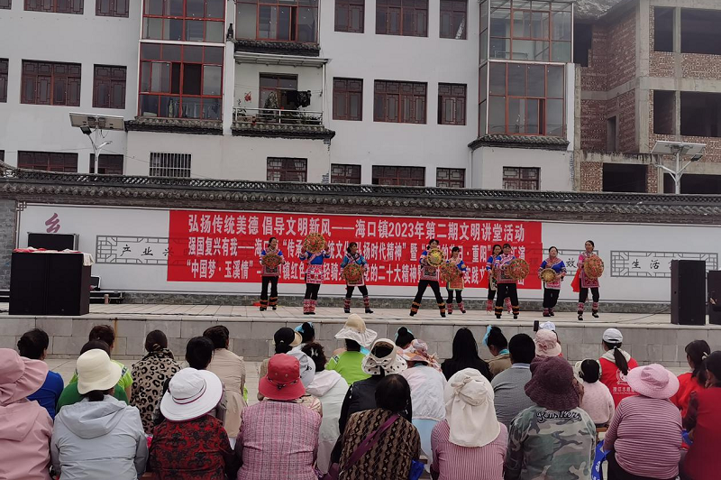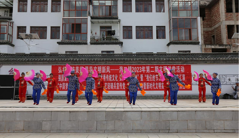 一、喜迎新时代,欢乐度重阳 10月23日下午,以“强国复兴有我”为主题,海口镇组织各村(社区)文艺队在海口社区三组广场开展“传承优秀传统文化,弘扬时代精神”暨“我们的节日·重阳”文艺汇演活动,演出在海口镇老年大学花灯班《欢天喜地庆重阳》的翩翩舞姿中拉开了帷幕,伴随着舞蹈《看山看水看中国》、《天籁之爱》、《走进新农村》、《农民大乐作》,歌舞《海镜姑娘》、《永远跟党走》、说唱《擦亮眼睛防诈骗》等精彩节目,现场氛围进入了高潮,台上演员倾情演绎,台下观众们掌声不断,整场演出都洋溢着喜庆欢乐的节日氛围。活动中关于重阳节和电信诈骗的有奖问答环节观众亦是积极参与。