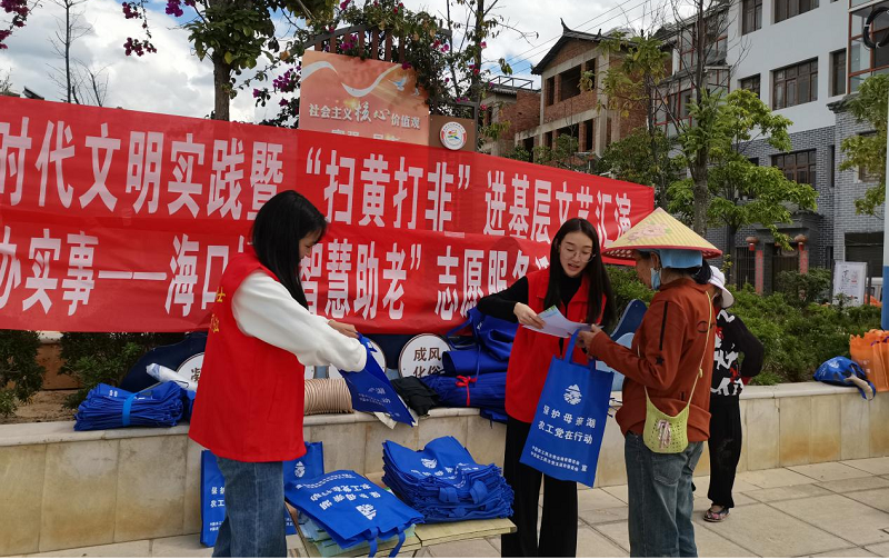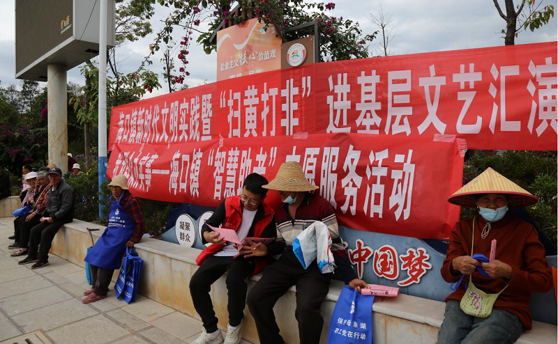 二、智慧助力生活,陪伴长者成长 文艺汇演活动现场,海口镇新时代文明实践所联合镇党群服务中心、综治中心,以“我为群众办实事”为主题,开展“智慧助老”志愿服务活动。通过在活动现场向群众分发群众普法宣传手册、环保袋、围裙的方式,向老年人讲解诈骗手段,提高老年群体防骗意识和反诈骗能力;提供数字化、智能化现场教学志愿服务,用实际行动帮助老年人融入智能社会,提升他们的获得感、幸福感、安全感。